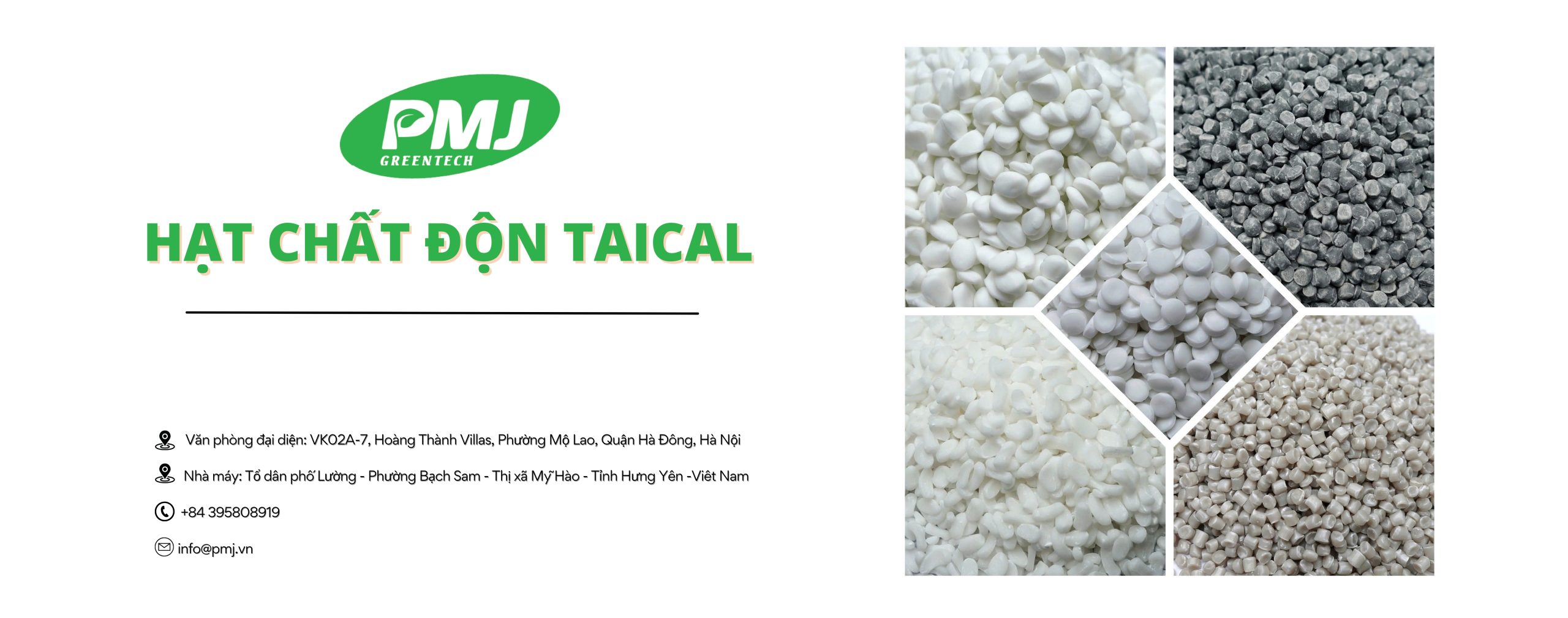 Hạt nhựa màu cô đặc của PMJ GREENTECH được sử dụng để tạo nên màu sắc của các sản phẩm nhựa như : Thổi màng, Cán cuộn, Dệt, Vải không dệt, Ép phun, Ép đùn, Thổi can / chai lọ…